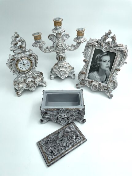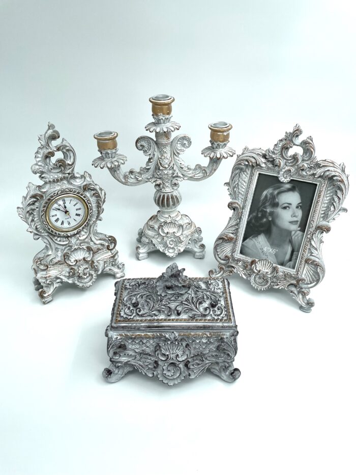 الوصف: طقم كلاسيكي مكون من 4 قطع ( ساعة، برواز، شمعدان، علبة تخزين )